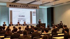 秋山社長からは、内定者への歓迎の言葉、そして介護の市場と魅力、こ れからのニチイケアパレスの指針などのお話しをいただきました。最後に は、「「選択的週休3日の導入」など多様な働き方改革を進め、処遇改善と ICT・介護テクノロジーを活用した時間の創出に取り組み、普遍の強みで ある「人財」がもっともっと輝ける会社に成長させたいと考えております。